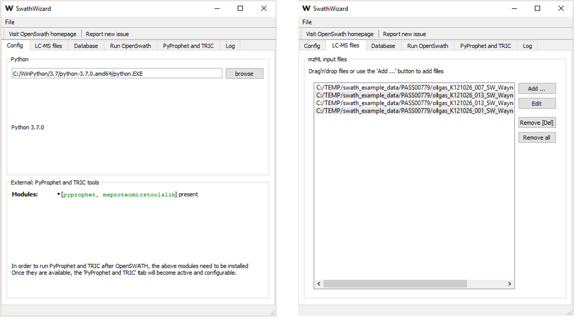 Users can enter the required input data (mzML MS/MS data, configuration files) in dedicated fields, usually by drag'n'droping files from the operating systems' file explorer (Explorer, Nautilus, Finder...). The output of the Wizard is both the intermediate files from OpenSWATH (e.g. the XIC data in .sqMass format) and the tab-separated table format (.tsv) from pyProphet and TRIC.