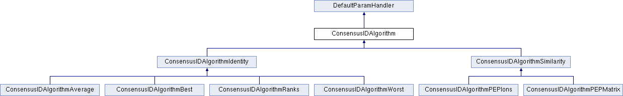 Derived classes should implement apply_(), which takes a list of peptide identifications and produces a map of peptide sequences with accompanying scores (and charge states). Currently there are two derived classes, OpenMS::ConsensusIDAlgorithmIdentity and OpenMS::ConsensusIDAlgorithmSimilarity. They serve as abstract base classes for algorithms that score only identical peptide sequences together and algorithms that take similarities between peptides into account, respectively.