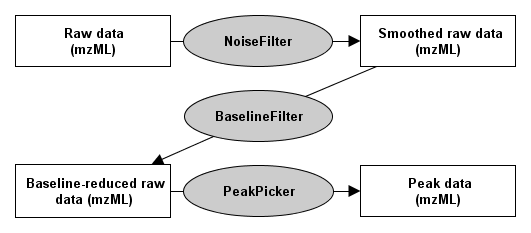 The first step shown here is the elimination of noise using a NoiseFilter. The now smoothed profile data can be further processed by subtracting the baseline with the BaselineFilter. Then use one of the PeakPickers to find all peaks in the baseline-reduced profile data.