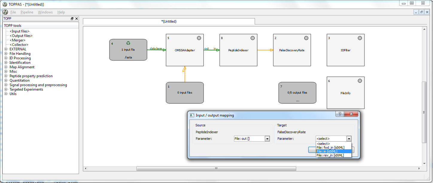 Next, the user has drawn some connections between the tools which determine the data flow of the pipeline. Connections can be drawn by first deselecting the desired source node (by clicking anywhere but not on another node) and then dragging the mouse from the source to the target node (if a selected node is dragged, it is moved on the canvas instead). When a connection is created and the source (the target) has more than one output (input) parameter, an input/output parameter mapping dialog shows up and lets the user select the output parameter of the source node and the input parameter of the target node for this data flow - shown here for the connection between PeptideIndexer and FalseDiscoveryRate. If the file types of the selected input and output parameters are not compatible with each other, TOPPAS will refuse to add the connection. It will also refuse to add a connection if it would create a cycle in the workflow, or if it just would not make sense, e.g., if its target is an input file node. The connection between the input file node (#1) and the OMSSAAdapter (#5) tool is painted yellow which indicates it is not ready yet, because no input files have been specified.