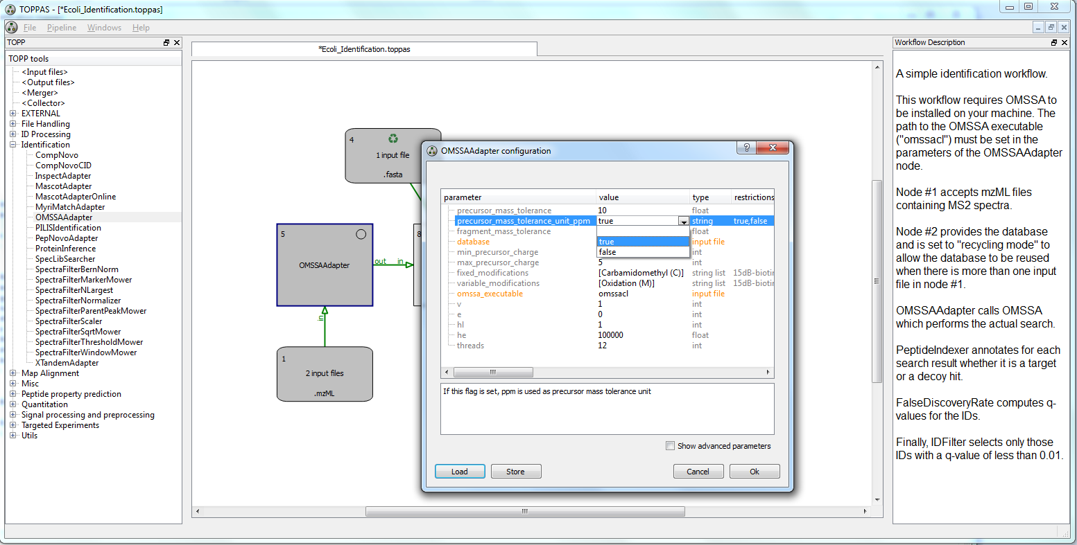 The following figure shows a possible next step: the user has double-clicked one of the tool nodes in order to configure its parameters. By default, the standard parameters are used for each tool. Again, this can also be done by selecting Edit parameters from the context menu of the tool.
