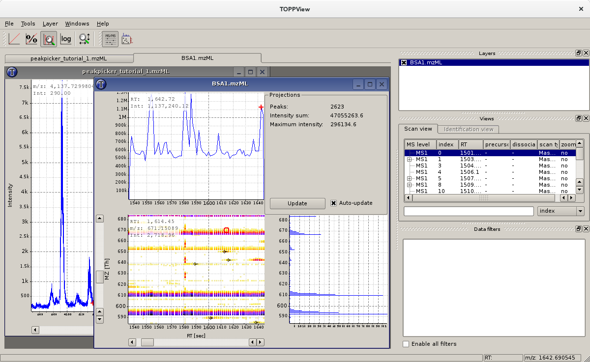 TOPPView is a viewer for MS and HPLC-MS data. It can be used to inspect files in mzML, mzData, mzXML and several other file formats. It also supports viewing data from an OpenMS database. The following figure shows two instances of TOPPView displaying a HPLC-MS map and a MS raw spectrum:
