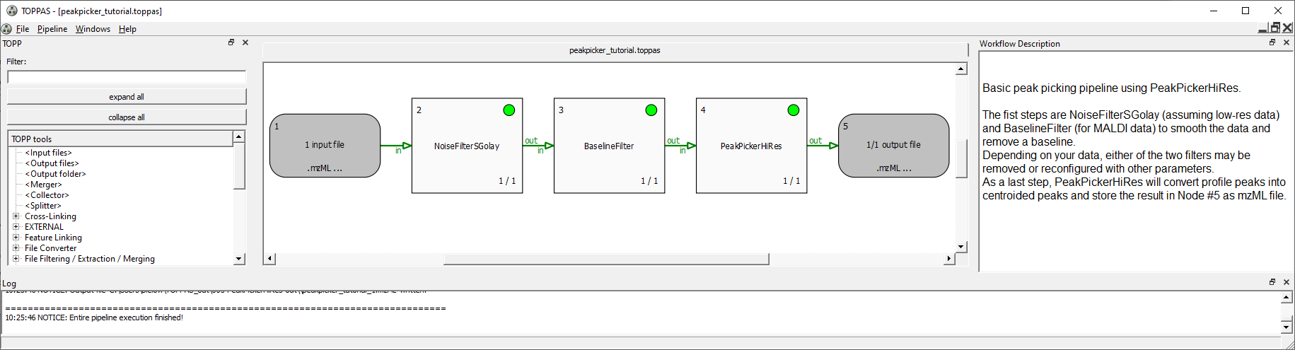 TOPPAS allows you to create, edit, open, save, and run TOPP workflows. Pipelines can be created conveniently in the TOPPAS GUI. The parameters of all involved tools can be edited within TOPPAS and are also saved as part of the pipeline definition in the .toppas file. Furthermore, TOPPAS interactively performs validity checks during the pipeline editing process and before execution (i.e., a dry run of the entire pipeline), in order to prevent the creation of invalid workflows. Once set up and saved, a workflow can also be run without the GUI using ExecutePipeline.